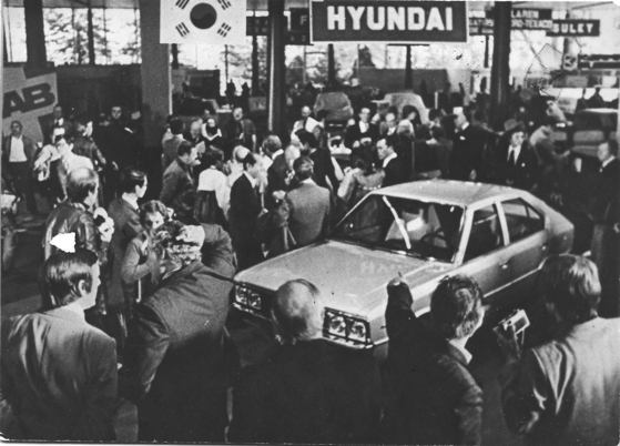 1974년 이탈리아 토리노 모터쇼에 전시된 포니. 디자인은 완성됐으나 생산은 시작하지 않은 때 였다. 포니는 1976년 초 공식 출시됐다. [사진 포니정재단]