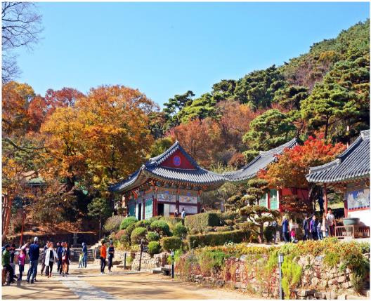 매표소 입구에서 사찰 건물을 찾아가는 길이 조금 오르막이었으나 운동삼아 걷기에 딱 좋은 코스였네요. 가는 길에 700년과 350년이 됐다는 은행나무 두 그루가 아주 관록있게 버티며 우리를 맞아주었습니다. 사찰 마당에 들어서니 단풍나무들에 둘러싸인 사찰 전경에 역사적 품위가 철철 넘쳐났었네요. 우리 일행들은 소그룹으로 기념사진을 찍다 지나가는 이에 부탁하여 단체사진도 찍었습니다.