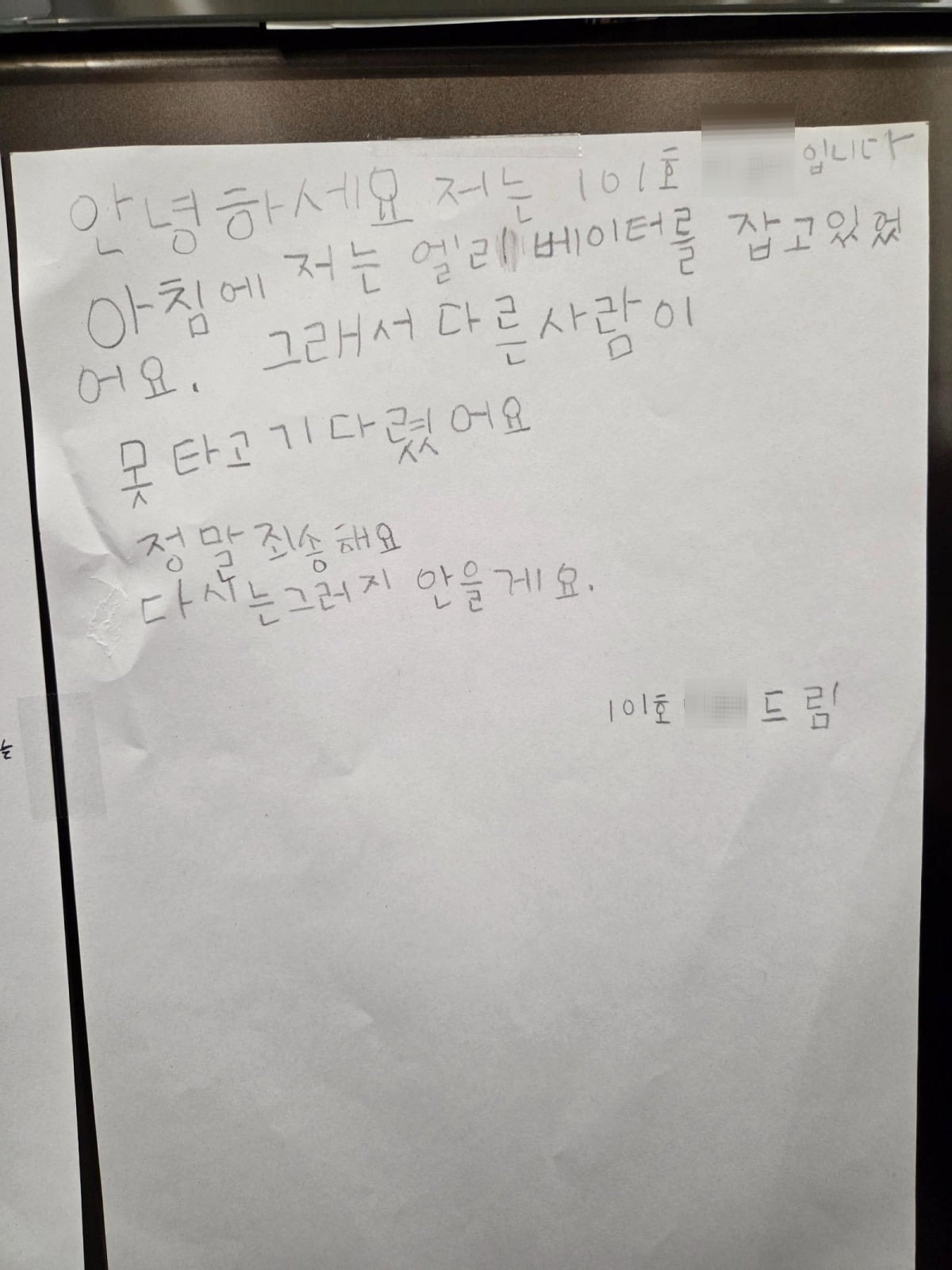 "엘베 오래 잡아 죄송해요"…아이 자필 사과문에 이웃들 반응