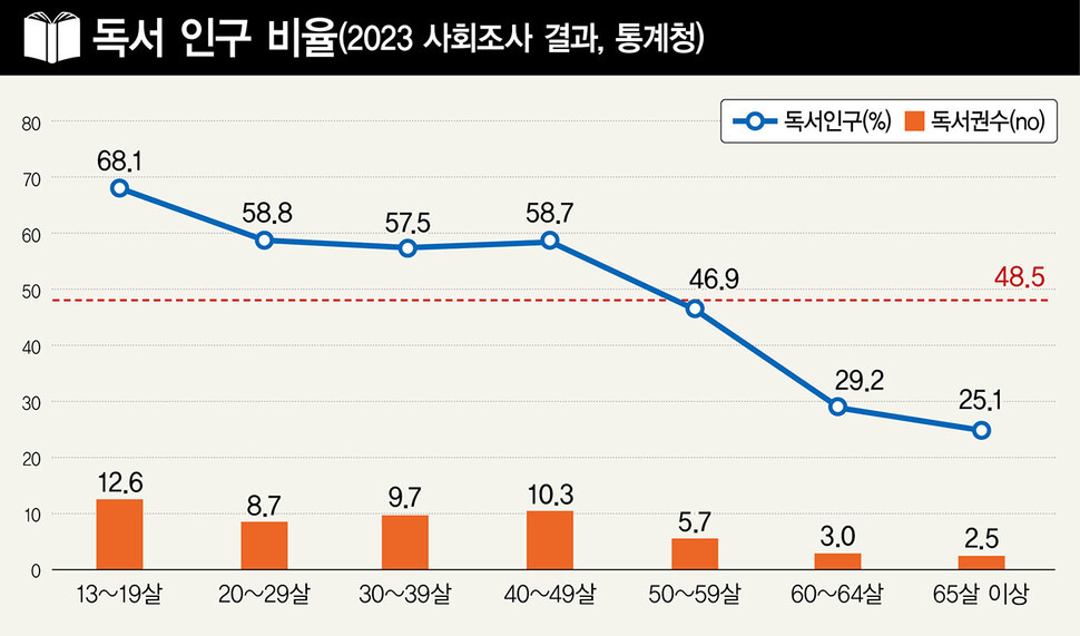 2023년 말 기준, 독서 인구 비율은 평균 48.5%다. 우리 국민 절반 이상이 1년간 책을 한 권도 읽지 않는다는 뜻이다. 60살을 기점으로 독서율은 현저히 낮아진다. 1인당 독서량도 연간 7.2권 수준이다. 10대를 제외하면 40대가 10.3권으로 가장 많고, 60살이 넘으면 3권 아래로 떨어진다.
