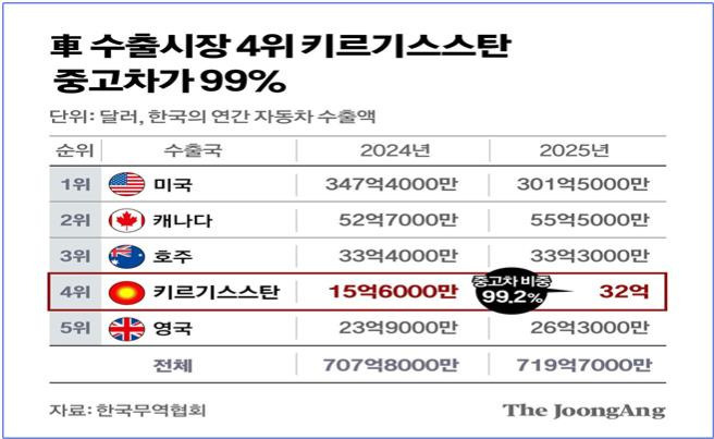 오늘 뉴스는 관심가는 뉴스들이 평소에 비해 제법 많이 눈에 띄었지만 소개하고 싶은 것들은 키르키즈스탄에 한국 중고차를 작년에 13만대나 팔아 한국차 전세계 수출국 중 미국, 캐나다, 호주 다음으로 수출금액 4위인 32억불을 기록했다 하네요. 이 나라에 집중적으로 수출한 중고차 비중이 99.2%에 달한다면서요. 대단히 흥미로운 뉴스였습니다. 키르키즈스탄 내수용이 아닌 러시아에의 재수출용이란 사실도 처음 듣는 얘기였네요.